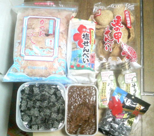 亀の甲せんべ・塩せんべ・沖縄黒飴に削り節。