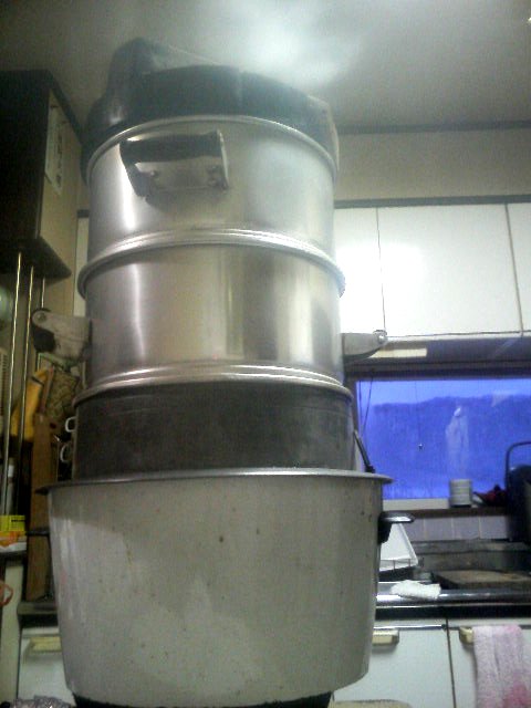 そんなんで顔も洗うか洗わないかのうちに、餅米がふけたらとっとと処理せないかんのだわ。