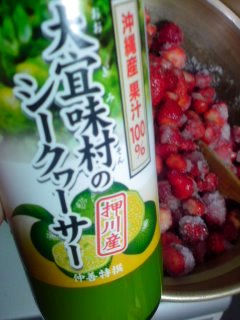 先にこのシークワーサーを苺にぶっかけて置いてから、鍋に入れて砂糖もぶっ込んで開始するのね。