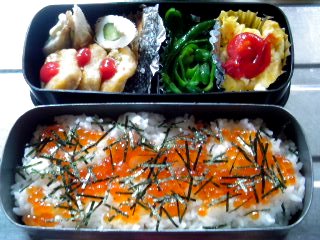 ちょうど鮭を一匹まるまんま貰ってさ、鮭もイクラも大量にあった為にできたベント。