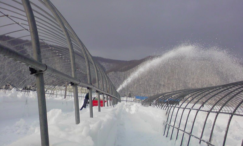 骨組みのギリギリまで入っていき、所有の除雪機を使っておおかたの雪を飛ばします。