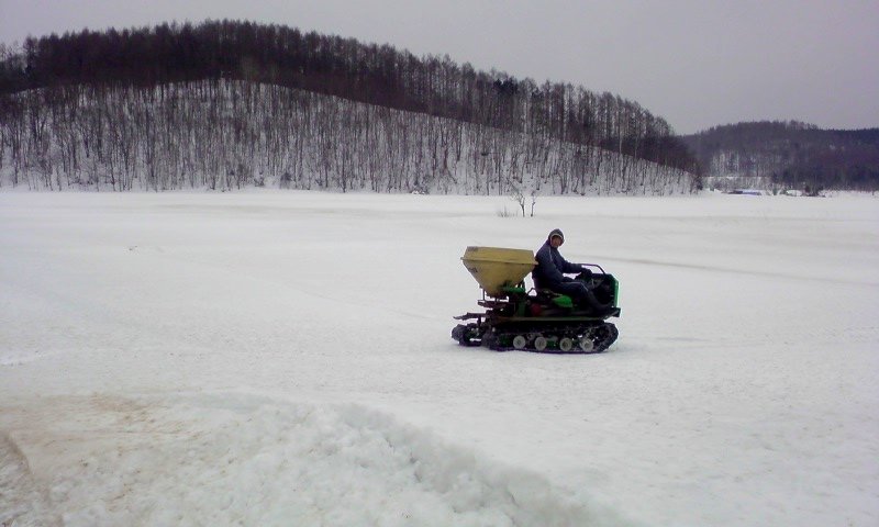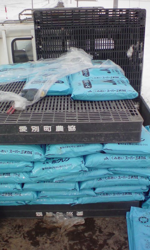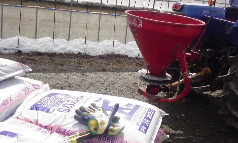 ハウスの除雪の合間に、今度は田んぼに融雪剤を蒔く作業がありました。