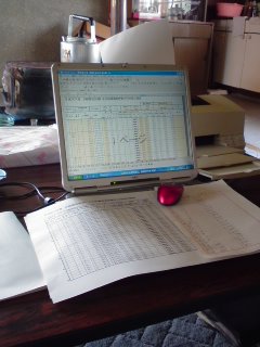 会館の下では皆さんで脱穀作業、上では一人背中を丸めながらカタカタと集計作業。
