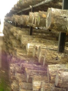 約1mぐらいある木にドリルで穴を開け、そこに椎茸の菌を打ち込んで、ロウで蓋をして熟成させるんだって。